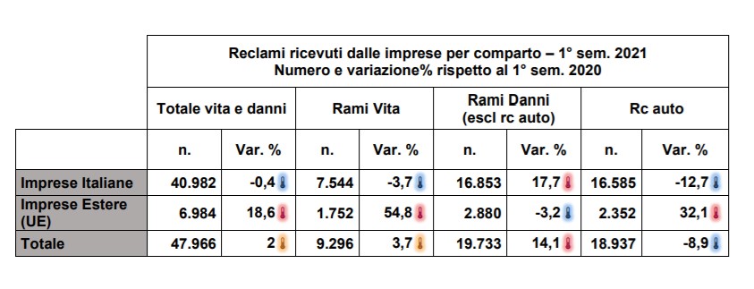La tabella che segue illustra la ripartizione dei reclami per tipologia di impresa (italiane, estere) e per comparto (vita, rami danni diversi da RC Auto, RC Auto), con evidenza delle variazioni percentuali rispetto al corrispondente semestre 2020: