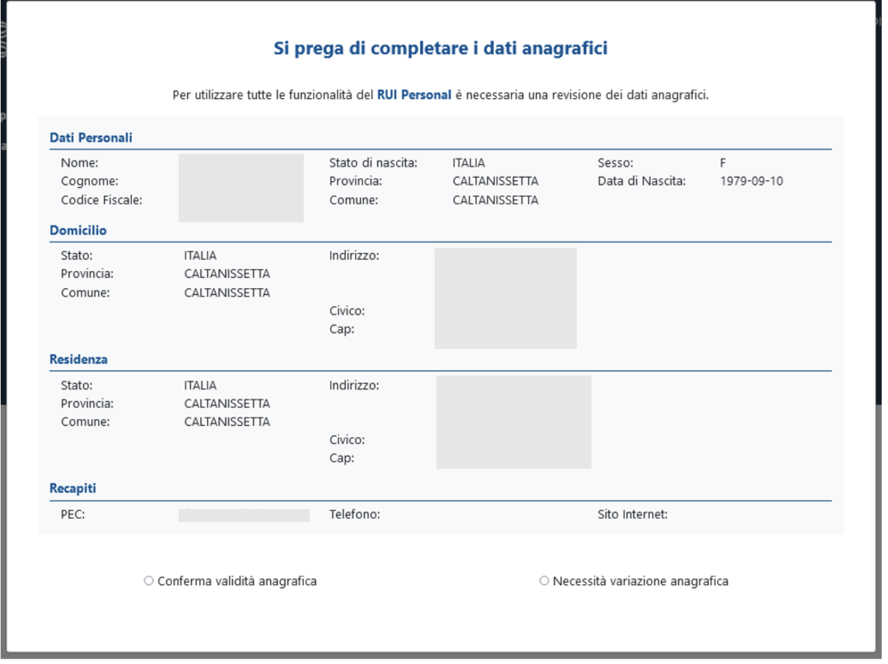 RICORDA: al primo accesso sulla Home Page del portale, ti apparirà una finestra che richiede di confermare i dati anagrafici già presenti nel RUI.